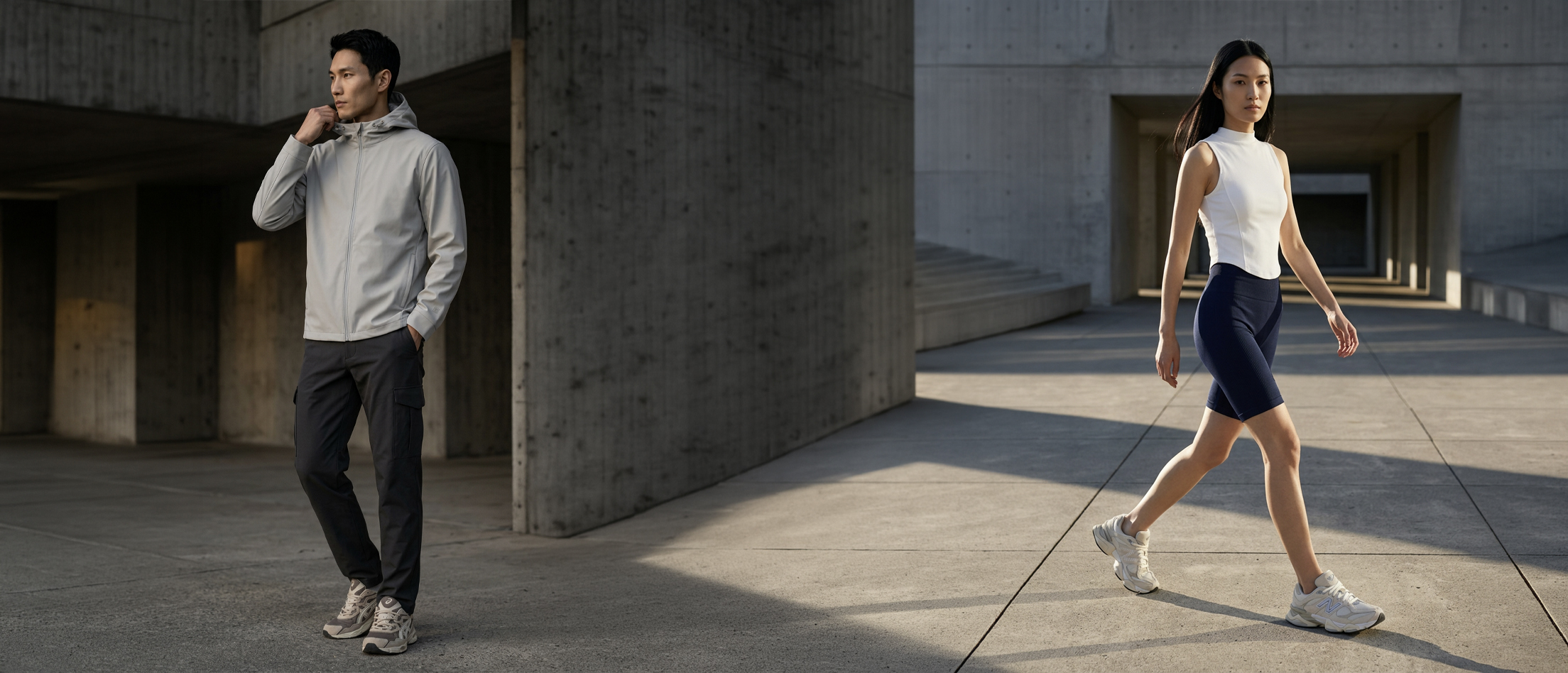 For motion, travel, and down time without switching into a different style. Lighter layers, flexible bottoms, and easy essentials designed for cycling, walking, running, stretching, and recovery.